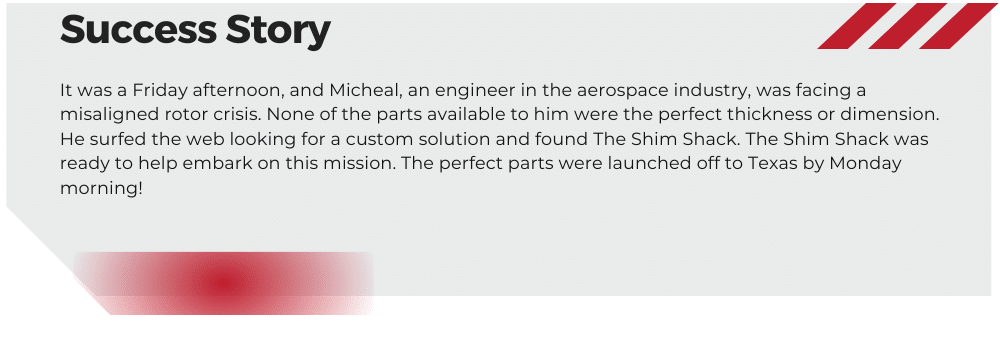 The precision requirements in Aerospace are exacting, and slight deviations can have significant consequences. The Shim Shack's custom shims are crafted with meticulous attention to detail, ensuring the perfect fit for every application. This tailored approach translates directly into optimal performance, reliability, and safety in the skies.